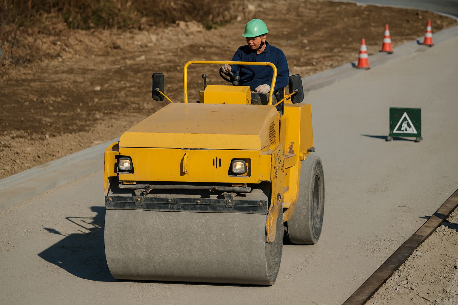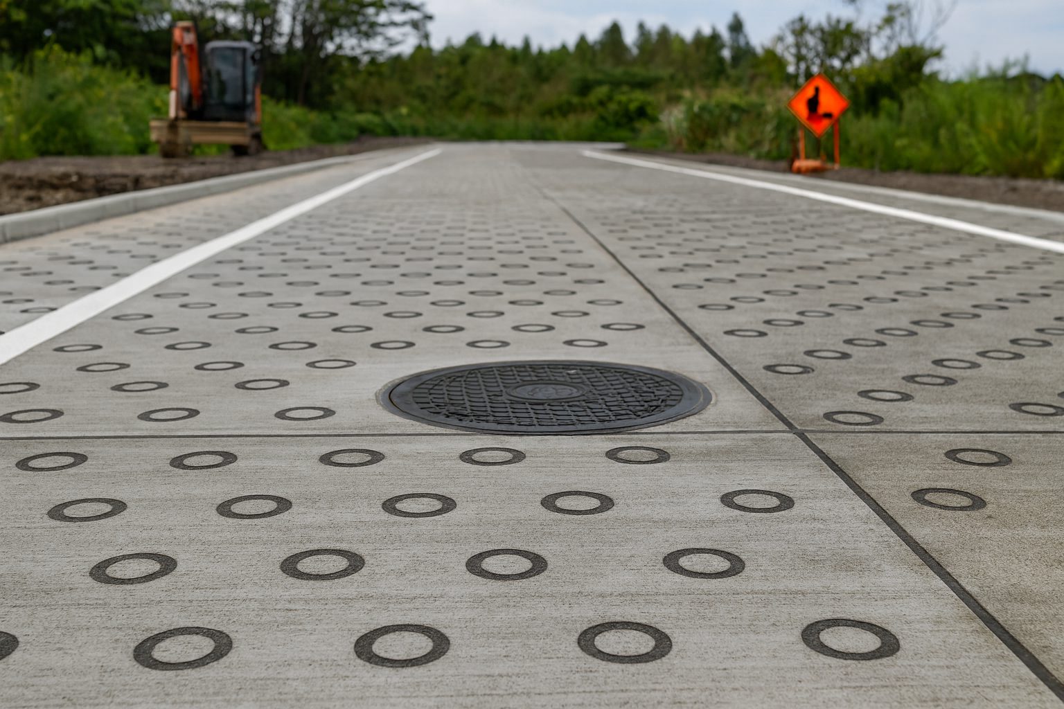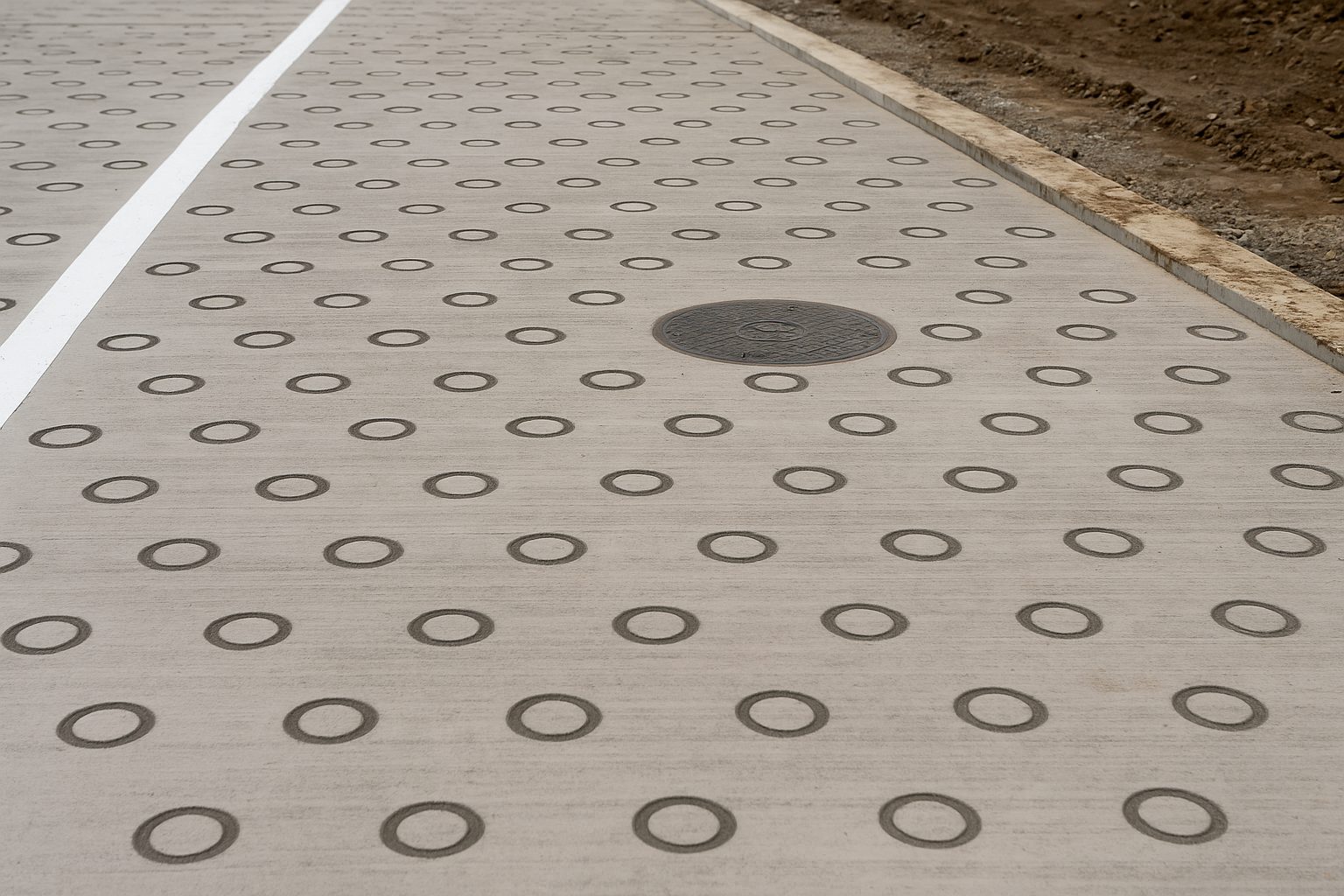 コンクリートの舗装工事手順を説明しています。短い施工期間で仕上がるアスファルトと違い、硬化に時間の掛かる生コンを打設して、硬化させる工事です。真空コンクリート工法と呼ばれる滑り止め対策工事についても紹介しています。